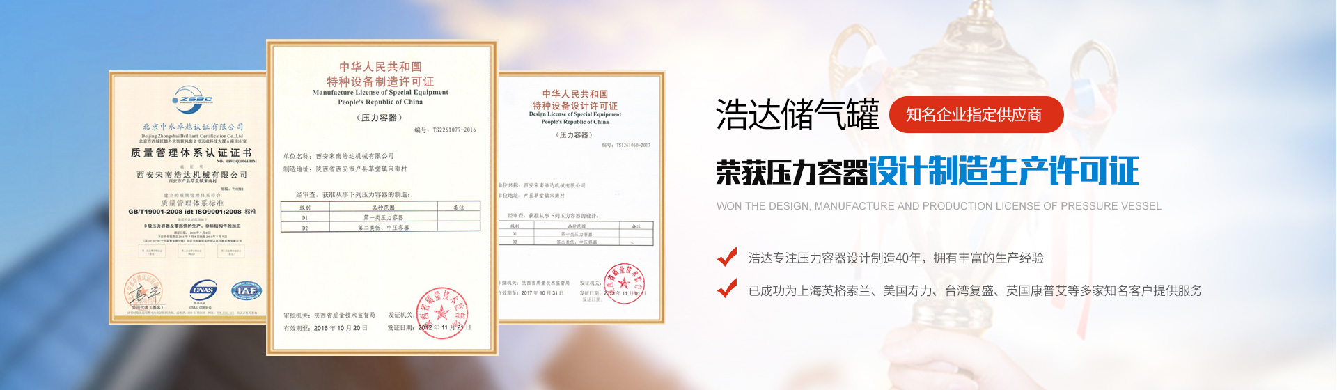 西安宋南浩達機械有限公司是陜西第一批取得壓力容器制造許可證的廠家之一,是陜西省定點生產(chǎn)壓力容器的專業(yè)工廠,現(xiàn)已有近四十年的制造歷史。現(xiàn)已有壓力容器設(shè)計、制造及C級鍋爐的生產(chǎn)許可證,是部級先進企業(yè),省級安全生產(chǎn)單位,市級標準化先進企業(yè),市級重合同、守信譽單位,二級計量企業(yè)。